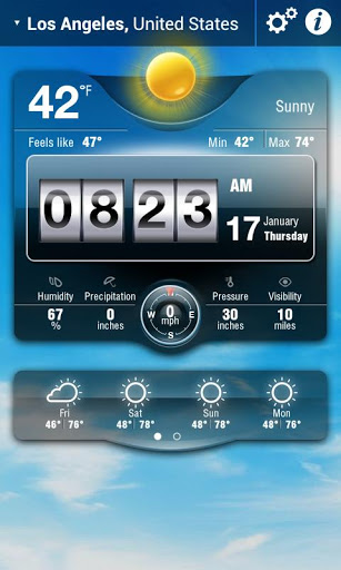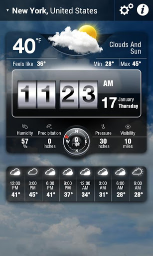 Prognoza meteo este prezentata pentru urmatoarele 12 ore sau pentru 7 zile, afiseaza presiunea atmosferica, umiditatea, vizibilitatea,directia sau viteza vantului.